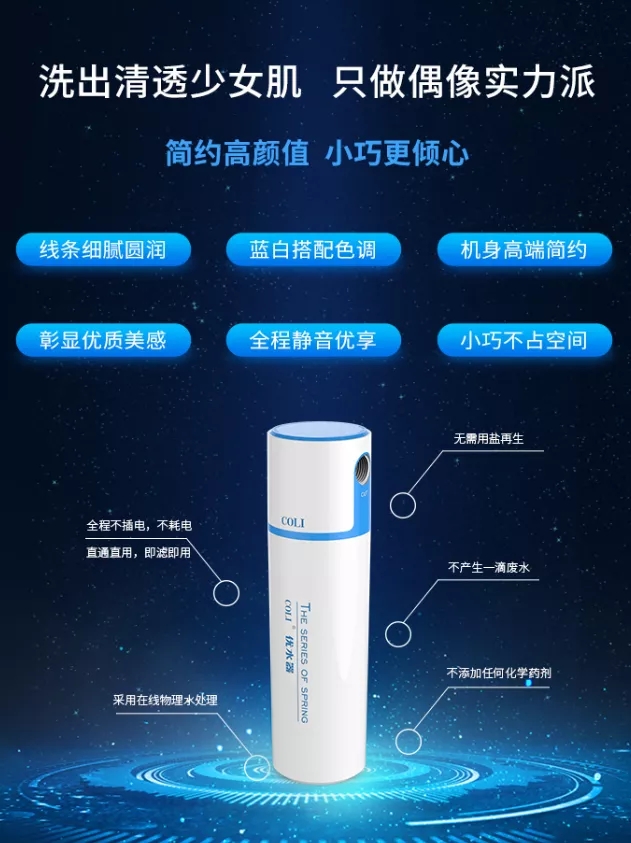 很多爱美女性对净肤、美肤仪心动神驰,但却因为安装及后期维护问题,望而却步。COLI优水器(净肤仪)线条细腻圆润、蓝白搭配色调、机身高端简约,彰显优质美感。此外,全程静音,小巧不占地,可释放更多家用空间。