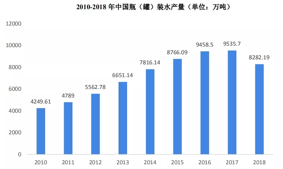 随着人口增长、生活水平和城市化率的提高,今后较长时期内生活用水量仍会不断增加,但增长速度相对缓慢。目前,我国饮用水的市场规模不断扩大,以瓶(罐)装饮用水市场为例,人们对瓶(罐)装用水的消费量也将在未来几年持续稳定地增长。我国消费包装饮用水的人口已占总人口的30%以上,这说明相当一部分人群开始以包装饮用水作为日常的饮水来源。从全国总产量上来看,近年我国包装饮用水占全部饮料产量的比重持续扩大,从2014年的46.87%一路上涨至2017年底的52.41%。我国瓶(罐)装水产量呈增长趋势,2013年后增速放缓,2017年我国瓶(罐)装水产量9535.73万吨,同比增长0.82%;2018年瓶(罐)装水产量为8282.19万吨。