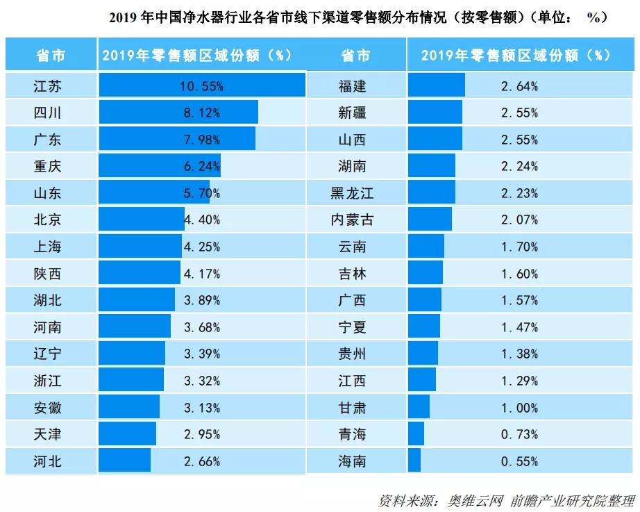 从具体的省市净水器线下渠道的零售额分布来看,2019年江苏省以10.55%的市场份额高居首位;零售额份额占比高于5%的省市地区分别为江苏省、四川省、广东省、重庆省以及山东省。