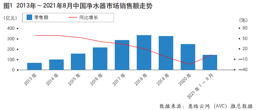 进入2021年,线下市场开始复苏。奥维云网(AVC)数据显示,2021 年 1~8 月,中国净水器销售额为 134 亿元,同比增长 2.4%。其中,线下市场销售额同比下降 5.6%,线上市场同比增长 15.3%。