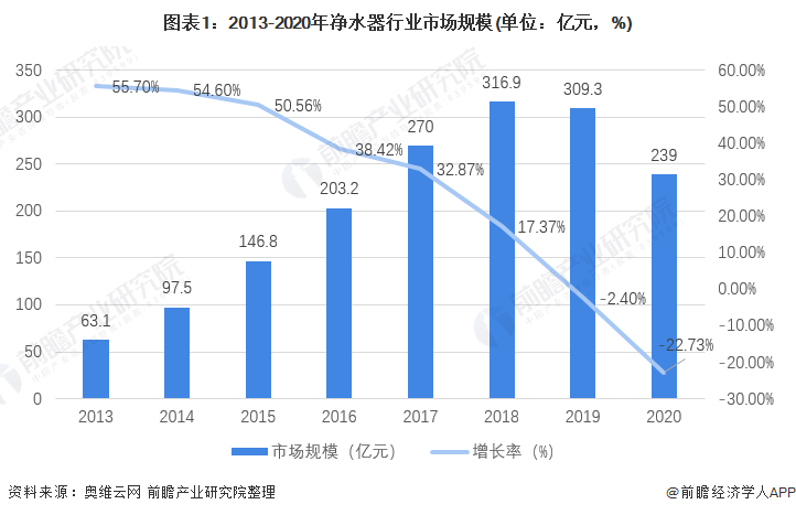 根据奥维云网数据,2013-2018年,中国净水器行业市场规模逐年升高,2018年达到316.9亿元,同比增长17.37%。2019年和2020年,市场规模出现下滑,2020年仅为239亿元,跌破300亿元,同比下降22.73%。