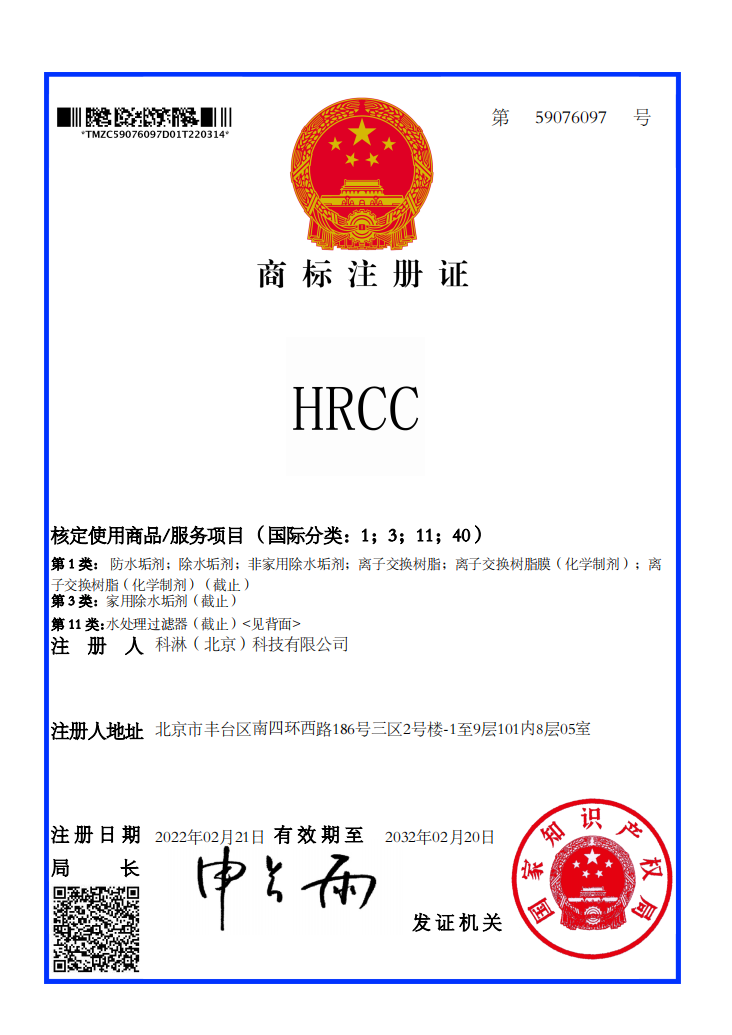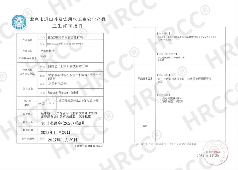 2023年11月,经过严谨的质量审查和检测流程,科淋旗下HRCC进口阻垢滤料成功获得卫健委颁发的“北京市进口涉及饮用水卫生安全产品卫生许可批件 ”(批准文号:京卫水进字(2023)第9号)。